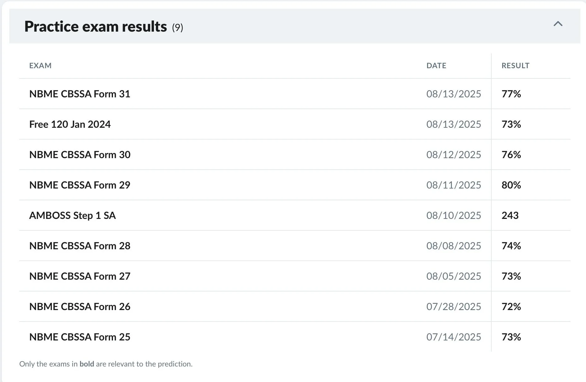 By mid-July, I was about 70–80% through Step 1 content and started taking NBMEs. I did all of them offline, but I was strict: timed blocks, no peeking at answers, full test-day simulation. My trick for time management was to finish every 50-question block in 1 hour instead of 1 hour 15 minutes. That forced me to practice being quick. This honestly helped me tremendously in the exam day because my time management during the real deal exam was solid.